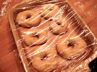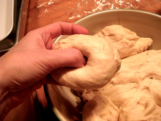 - Punch down dough. Take one bowl, tear dough in half, then halve each of those halves, then tear each of those halves into thirds (in other words "Make 12 equal balls of dough"). Form them into bagel shapes by poking your thumb through the middle of the dough ball and working your hand around (pictured). Lay them on wax paper in baking pans. Repeat with other bowl. Cover pans with plastic wrap and place in fridge overnight.