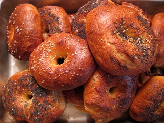 After I slide the bagels into the oven, I pour a little glass of 6 or 7 ice cubes into a cast iron pan on the bottom of the oven and close the door. This is common practice in baguette baking (not that I've ever done that) and does something good to the crust.