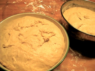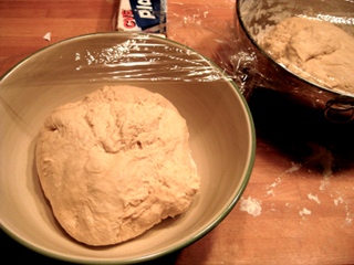 - Very lightly grease two large bowls. Separate the dough into two equal parts (the stiffness of the dough should make this a little difficult), put each part into a bowl, cover, and put them in the oven (turned off) to rise for an hour or more. (I've forgotten about it for a few hours and nothing terrible happened)