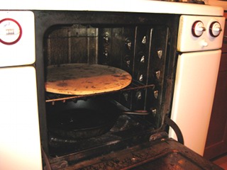 - In the morning, take the bagels out of the fridge and set a pot of water on the stove to boil (I use a 4 quart saucepan, but there's nothing magic about this). Put the pizza stone in the middle of the oven and place a cast iron pan on the bottom of the oven. Heat oven to 500. (Note that this recipe works just fine with a 60 year old oven)