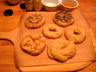 - Lay a piece of parchment on your pizza peel. Transfer the bagels from the towel to the peel and sprinkle on toppings to taste. (Don't use an egg wash or anything. Yuck). I use poppy seeds, white sesame seeds, coarse salt, and dried onions from www.penzeys.com. If you use the dried onions, soak them in a little water before putting them on. They won't get quite as blackened this way.